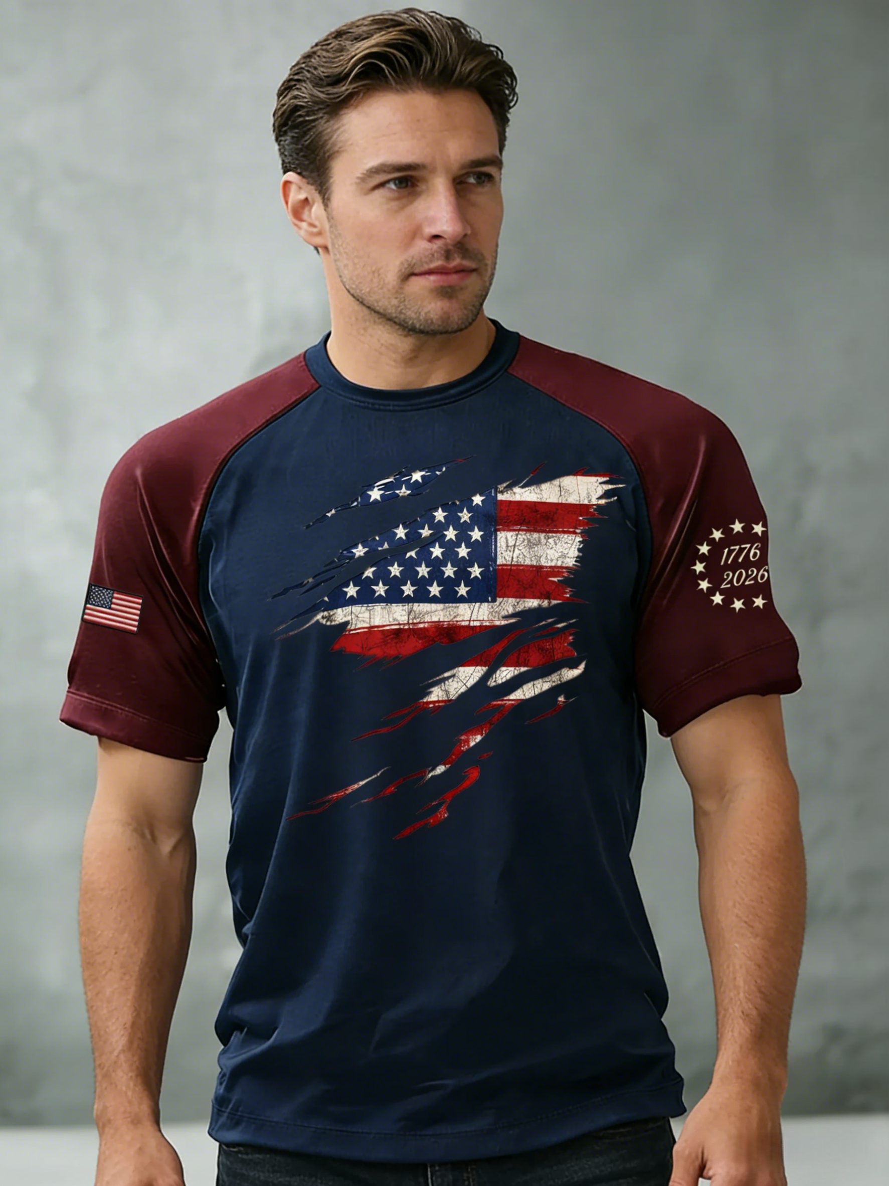 A bold distressed American flag graphic on the front with a 1776–2026 commemorative print, plus American flag accents on the sleeves for extra patriotic style.